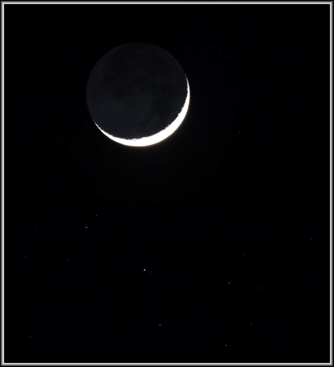 Aktivität des Monats: Der Mond steht direkt bei M45 (Plejaden). Fotografische Abbildung Canon EOS R5;600mm;f8;1/30s am 19.04.2026